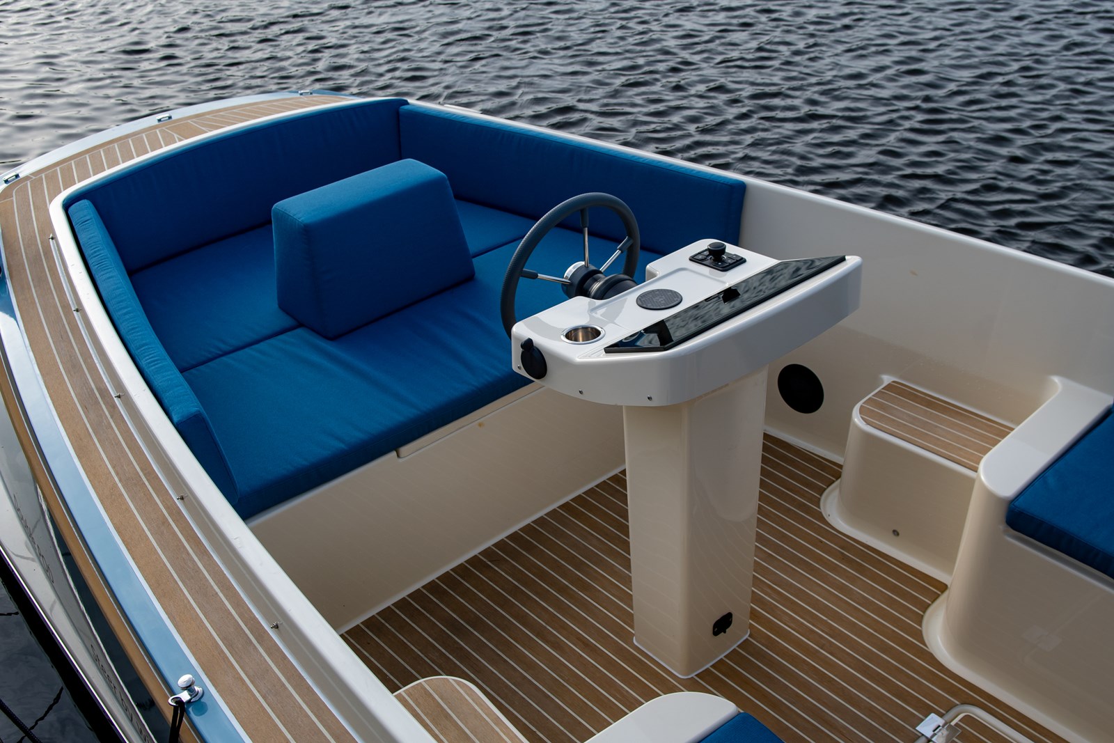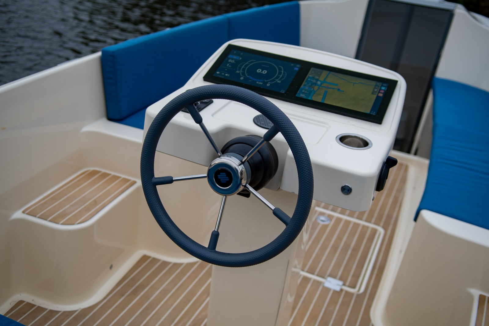 De standaard aandrijving is een 4kW hydraulisch bestuurde POD-motor met een 13.8kWh lithium accupakket. Daarmee bereik je maximaal 7 knopen, 13km/u. Er zijn diverse upgrades van motoren en batterijen mogelijk. De accucapaciteit is uit te breiden naar 17kWh of nog meer. Ook is er een 8kW motor beschikbaar, De testboot had het optimale pakket met 2 Pod-motoren van 4kW. Daarmee heb je ook de voordelen van tweemotorige besturing. Optioneel is een steer-by-wire upgrade. Dat betekent dat de 2 motoren onafhankelijk van elkaar worden bestuurd met een speciaal ontworpen elektronisch stuurwiel. Dit ‘fly by wire’ systeem is te koppelen aan een speciale joystick. Zo’n stuurpook kwamen we niet eerder tegen bij elektrische aandrijvingen, maar het maakt afmeren kinderspel. Ook kun je bijvoorbeeld zijwaarts in- en uitparkeren.