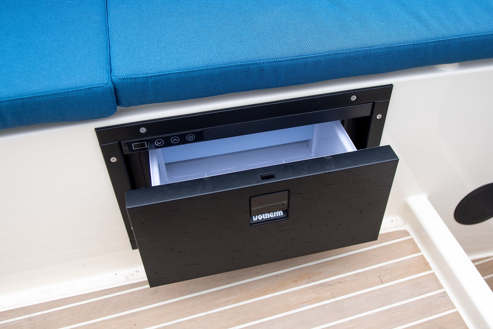 De indeling is die van een moderne tender met een paar bijzonderheden. In de eerste plaats is er onder het voordek een kajuitje gemaakt dat ideaal geschikt is voor een toiletruimte. De plexiglas deuren en luik kunnen dan voor een minder transparant materiaal worden vervangen. Op de geteste boot ontbrak hier deur- en luikbeslag. in deze ruimte heb je zicht op de uitgebreide set batterijen die onder het voorste deel van de kuipbanken is gelaatst. Bergruimte vind je onder de twee losse luiken onder de langsbanken en daar is ook plek voor bijvoorbeeld een koellade zoals in de geteste Picnic 7. De stuurconsole is mooi slank. Er zijn aan weerzijden twee kleine opstaptreetjes. Achterin is een zonnedek met een losse ruggesteun voor de bestuurder.