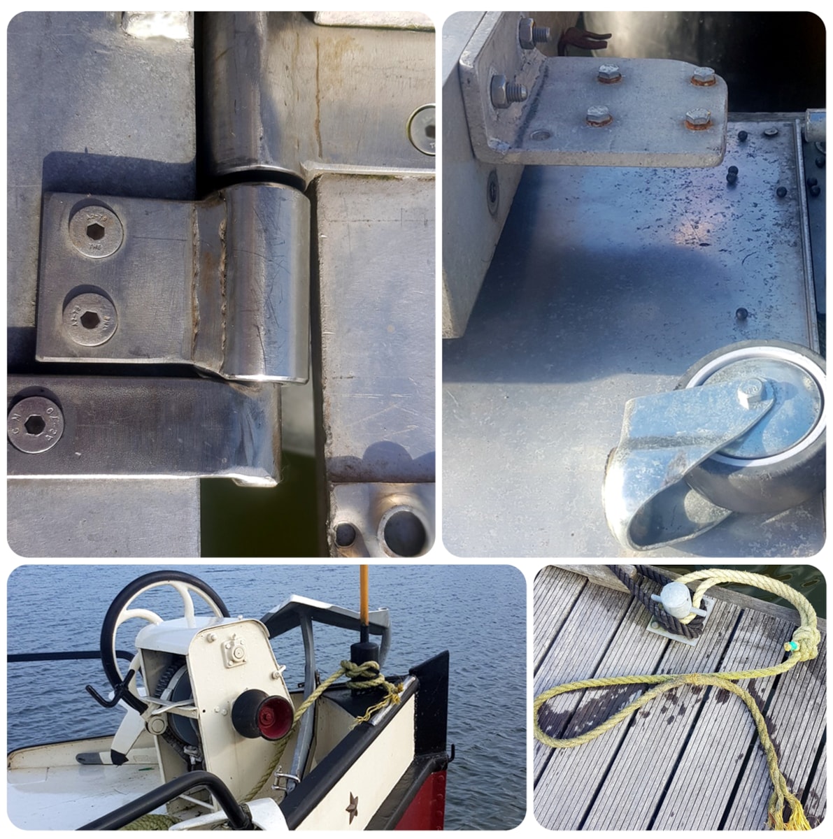 Toen de rust enigszins was weergekeerd, zag ik dat onze rolstoel/brancard brug achter op het schip flink ontzet was en dat de swingwielen er af lagen. Ook het voormalig beurtscheepje van mijn buurman lag ruim twee meter van de kade af, want de 20 mm dikke voortros was geknapt. Mijn bloeddruk steeg en flink verbolgen door het idiote vaargedrag, dook ik in de rubberboot en zette de achtervolging in. Toen ik op de splitsing van de waterwegen in de voorhaven van Monnickendam bakboord uit keek, zag ik het vaartuig nog net het kraandok van de naastgelegen jachthaven invaren, want meneer gaat kennelijk de winterstalling in. Daar aangekomen, trachtte ik contact te krijgen met de schipper die nerveus in de weer was in zijn ‘kraaiennest’ op het dak en hij gunde mij geen blik waardig.