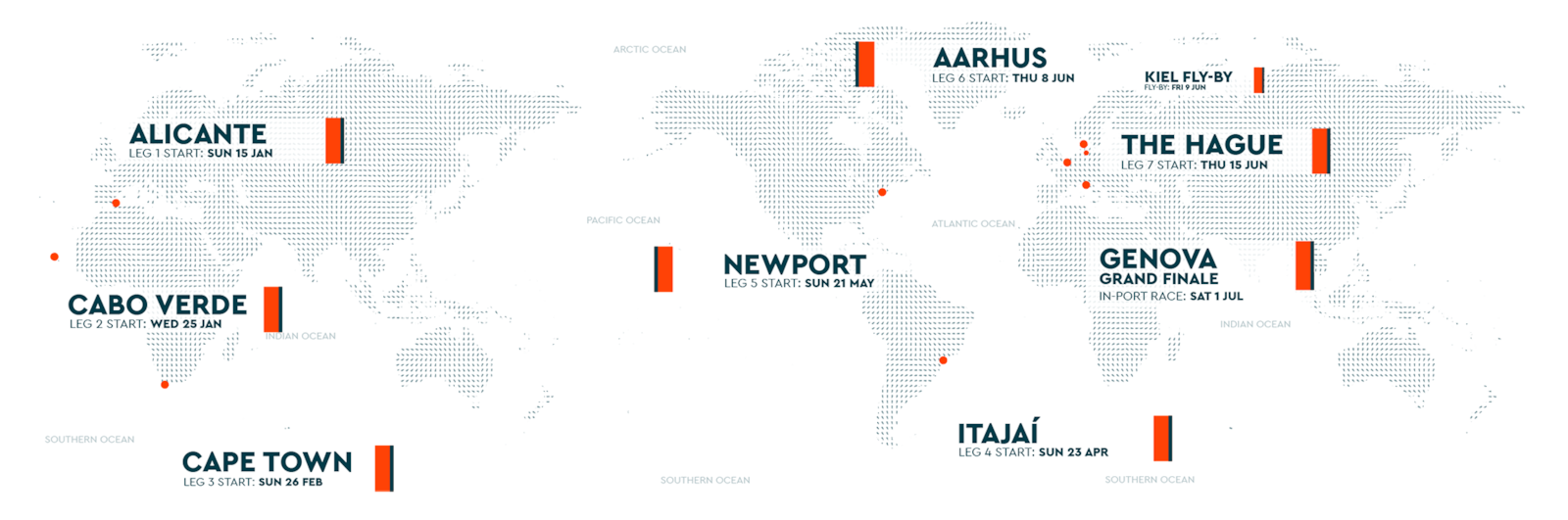 De eerste etappe is een sprint van 1900 zeemijl van Alicante naar Cabo Verde, de eerste keer dat de race stopt bij de Afrikaanse archipel. In het verleden zeilde de vloot langs de eilanden op weg naar het zuiden in de Atlantische Oceaan. In Cabo Verde zal de Ocean Race deelnemen aan de beroemde Ocean Week, met aandacht voor lokale en internationale duurzaamheidskwesties.