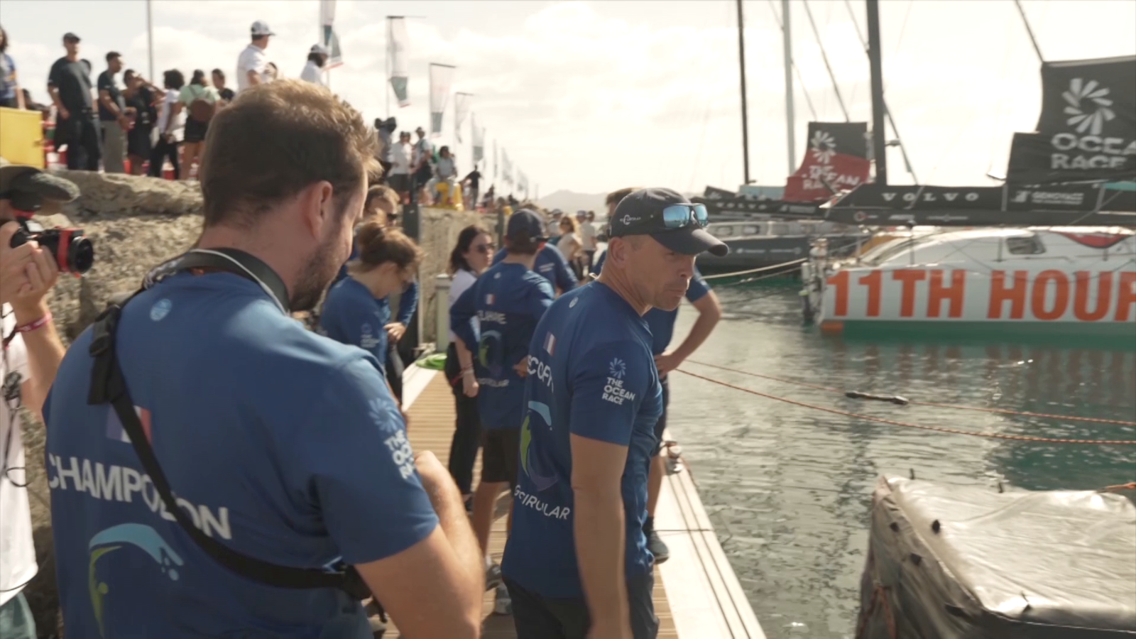 KAAPSTAD- Blijdschap aan boord van Team Holcim-PRB dat zondag als eerste in Kaapstad finishte in de tweede etappe van The Ocean. Bij zonsopgang op zondagochtend streden vier teams om de zege, met Biotherm, 11th Hour Racing Team en de Holcim - PRB bemanningen die in lichte en veranderlijke omstandigheden achter elkaar zeilden.
