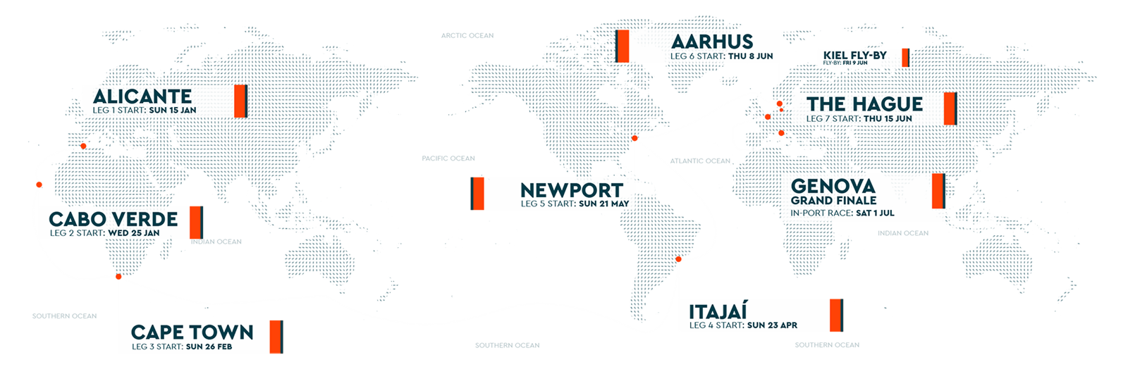 KAAPSTAD- Met meer dan 12.750 zeemijlen wordt Leg 3 van deze 14e editie van The Ocean Race de langste ooit in de 50 jaar sinds het begin van deze race. Na de start zondagmiddag in Kaapstad zullen de zeilers naar verwachting 30 tot 40 dagen onderweg zijn.