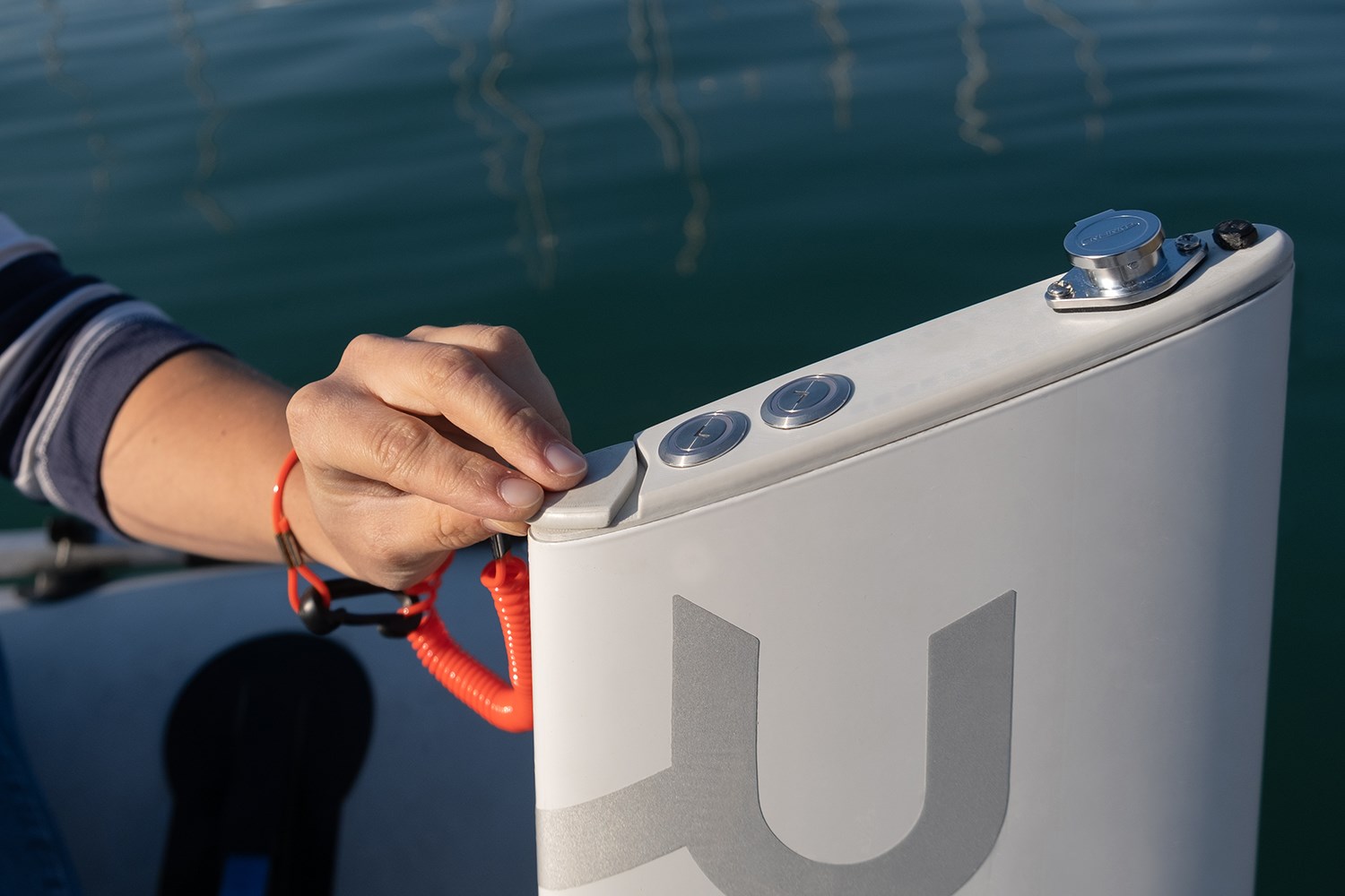 Het allesoverheersende idee van ”zo eenvoudig mogelijk” strekt zich ook uit tot de gebruikersinterface. Alles wat niet absoluut noodzakelijk is, is weggelaten. Er is geen gashendel. De Remigo heeft alleen aan de bovenkant drukknoppen om de snelheid in te stellen op een schaal van 1 tot 10. Een LED-balk toont het vermogen waarmee de propeller draait en in welke richting. Voor een snelle stop druk je twee knoppen tegelijk in. En een magnetische mini-console onder de besturing dient als killswitch. Trek je die uit, dan wordt ook de motor uitgeschakeld. Alles is vrij logisch.