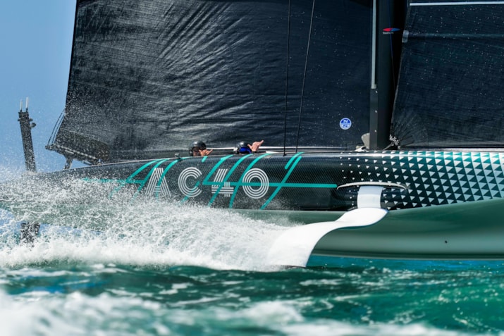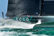 Collega Pieter-Jan Postma: “De AC-40 wordt gevaren met aan iedere kant twee teamleden, waarvan de voorste de boot stuurt door middel van een stuurwiel en de achterste de boot trimt met behulp van knoppen in plaats van een schoot. De zeilers blijven bij manoeuvres dus gewoon zitten op hun plek, er zijn dus twee stuurmannen of vrouwen en twee trimmers.’’