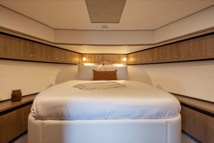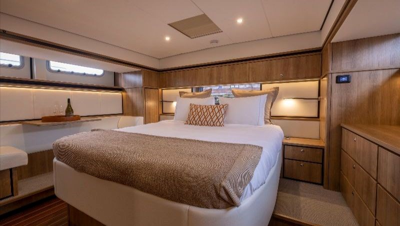 De bijzonder ruime achterkajuit is de Master Stateroom en voorzien van een riante tv, een twee persoons zitje, veel opbergruimte en een eigen toilet met separate douche.