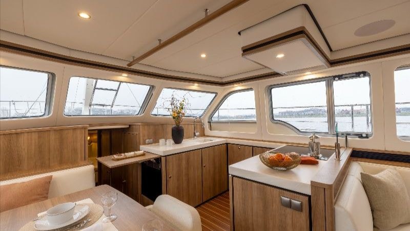Het interieur van de Grand Sturdy 550 AC Variotop® is van alle gemakken voorzien. Zo beschikt het jacht over vier slaapplaatsen in de ruime voor- en zijhut met toilet en douche in de gang. De ruime salon heeft een U-vormige salonbank, tv, pantry en L-dinette. Optioneel is het mogelijk de pantry te verdelen over stuurboord en bakboord, om zo een nog ruimere U-salonbank te creëren.
