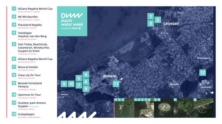 ALMERE- De Dutch Water Week vindt plaats tot en met 4 juni in Almere (Muiderzand), Lelystad (Bataviastrand) en Amsterdam (Marineterrein/Scheepvaartmuseuem). Het is een watersportfestival voor iedereen, met demonstraties van nieuwe urban watersporten, sup en kanotochten, opstapdagen, wedstrijden en allerlei clinics voor jong en oud. De hele week zijn er mogelijkheden om nieuwe watersporten uit te proberen, voor de kennismaker, de liefhebber, voor de relaxte en ook voor de fanatieke watersporter.