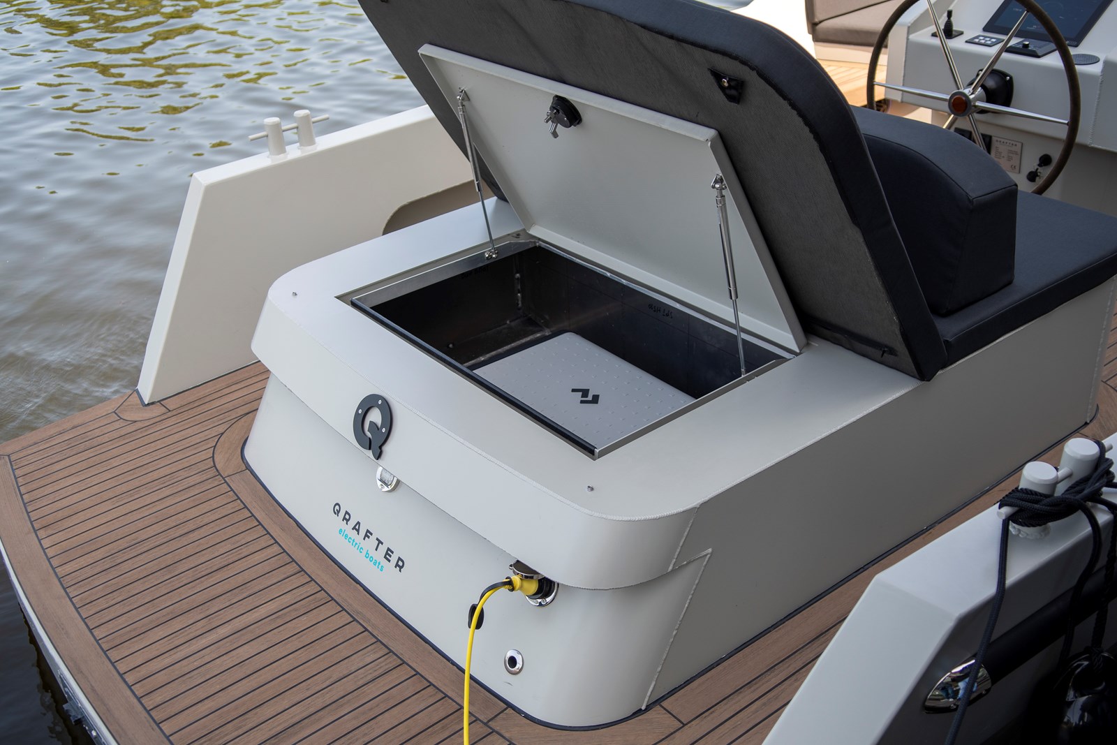 In het midden van de boot is een moderne, hoekige console met ervoor een lage motorruimte. Er is