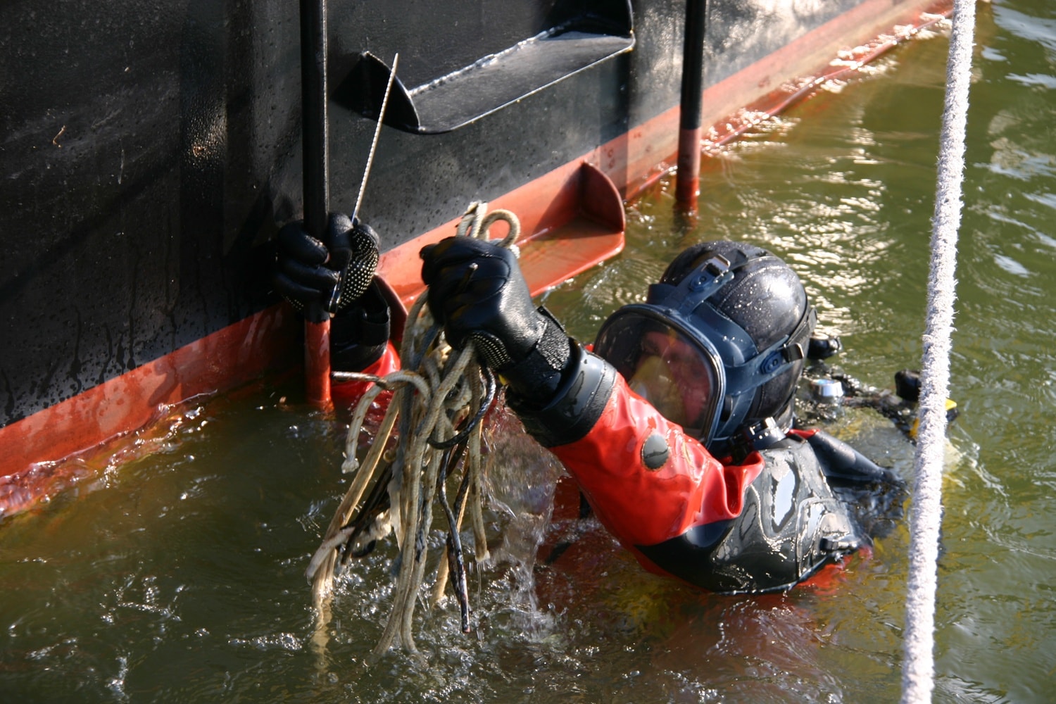 het zo vast dat we uit het water moeten, maar meestal levert een duiker met een scherp mes al