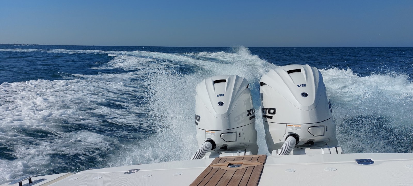 Wij testen de nieuwe motoren en het Helm Master EX systeem op verschillende boten. We begonnen onze testreeks met de White Shark 28 met een dubbele installatie van de F200 en koppeling met het Helm Master systeem. Daarvan testten we de functies van stay point en fish point uit. Vervolgens trokken we naar het onrustige water van de Middellandse Zee, pal voor de imposante Port Camargue. Met meer dan 8000 pleziervaartuigen is dit een van de grootste jachthavens van Europa. Buiten zorgde een dikke wind van 20 knopen voor golven van 1-2 meter en dan is het testen van de topsnelheid onmogelijk. Met ongeveer 4200 toeren konden we korte runs met een snelheid van rond de 30 knopen maken. Dan merk je de power en de souplesse van deze nieuwe viercilinders.