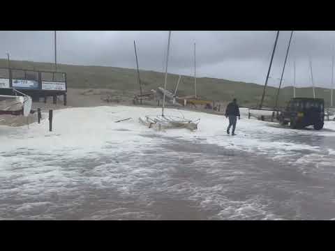 Ook op het strand van Bergen bij de plaatselijke zeilclub was het chaos en lagen allerlei catamarans bovenop elkaar.