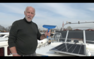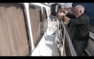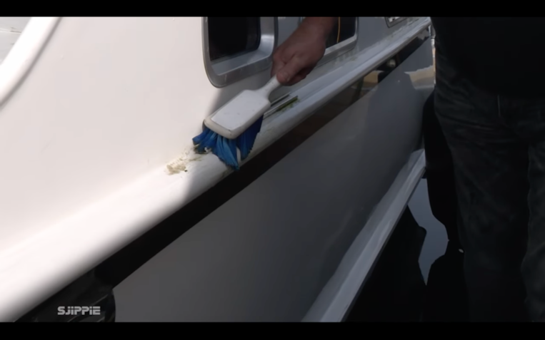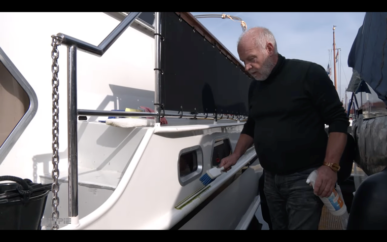 De zwarte strepen verwijderaar blijkt een alleskunner, want ook de zonnepanelen boven op de kajuit kunnen ermee behandeld worden. ’’Het is wel belangrijk, zeker als de zon schijnt...dat je de panelen eerst even koelt met water,’’ waarschuwt Cees die zichtbaar in zijn element is. Met een borstel op een lange steel ’vliegt’ hij over het dek.