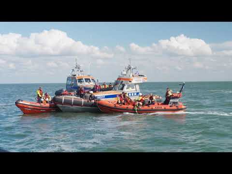 Reddingboten van KNRM-reddingstations Harlingen, Vlieland en Terschelling varen als eerbetoon aan alle overleden niet geredde personen een ronde om de KNRM-tulp ’Tara’ op de Waddenzee. Fotograaf Coen de Jong.