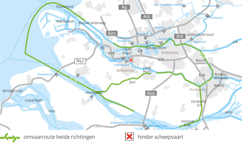 Door deze vaarwegversmalling wordt de passage bij de Spijkenisserbrug extra druk. En varen er regelmatig grote schepen in tegengestelde richting onder de brug door. Voor de veiligheid van iedereen op het water is er scheepvaartbegeleiding aanwezig. In deze situatie is het wenselijk het aantal vaarbewegingen te beperken.