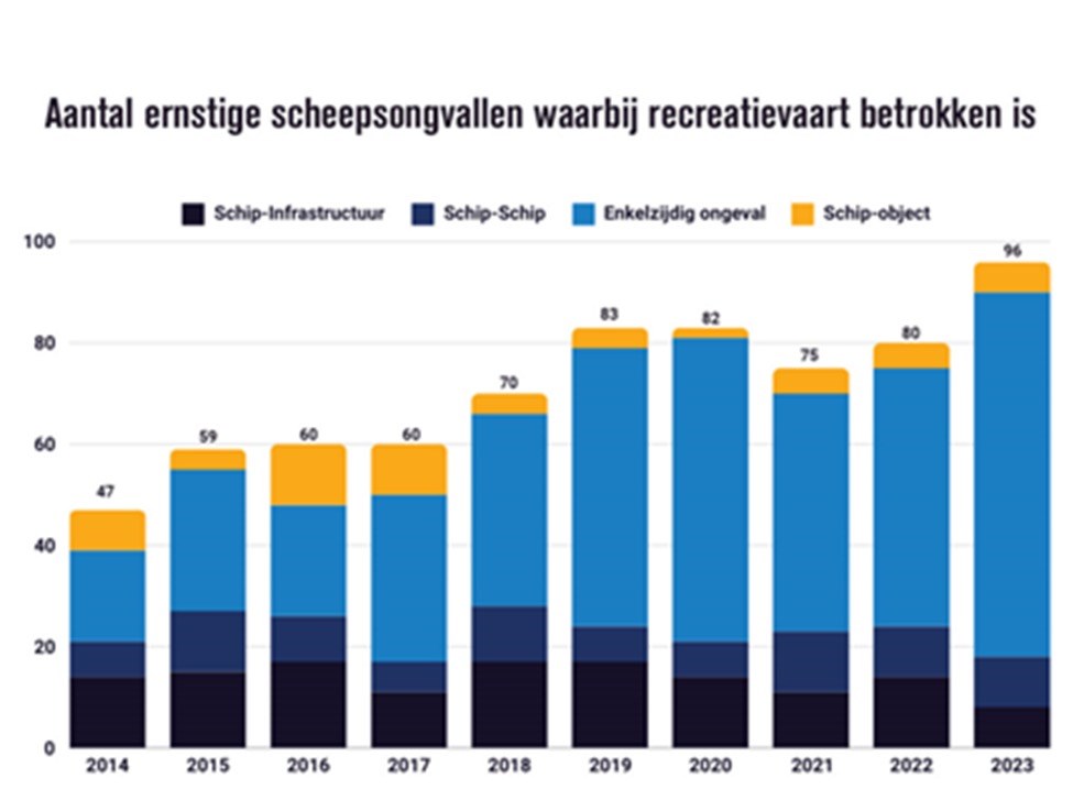 Volgens de Scheepsongevallen (SOS-)database van Rijkswaterstaat waren er vorig jaar 96 (zeer) ernstige scheepsongevallen waar recreatievaart bij betrokken was. Het betreft in 72 gevallen een enkelzijdig ongeval (t.o.v. 51 in 2022). Het aantal eenzijdige ongevallen met recreatievaart vertoont al een aantal jaren een stijgende trend. De meest voorkomende eenzijdige ongevallen in de recreatievaart waren lek raken/zinken (36x) en scheepsbranden (20x).