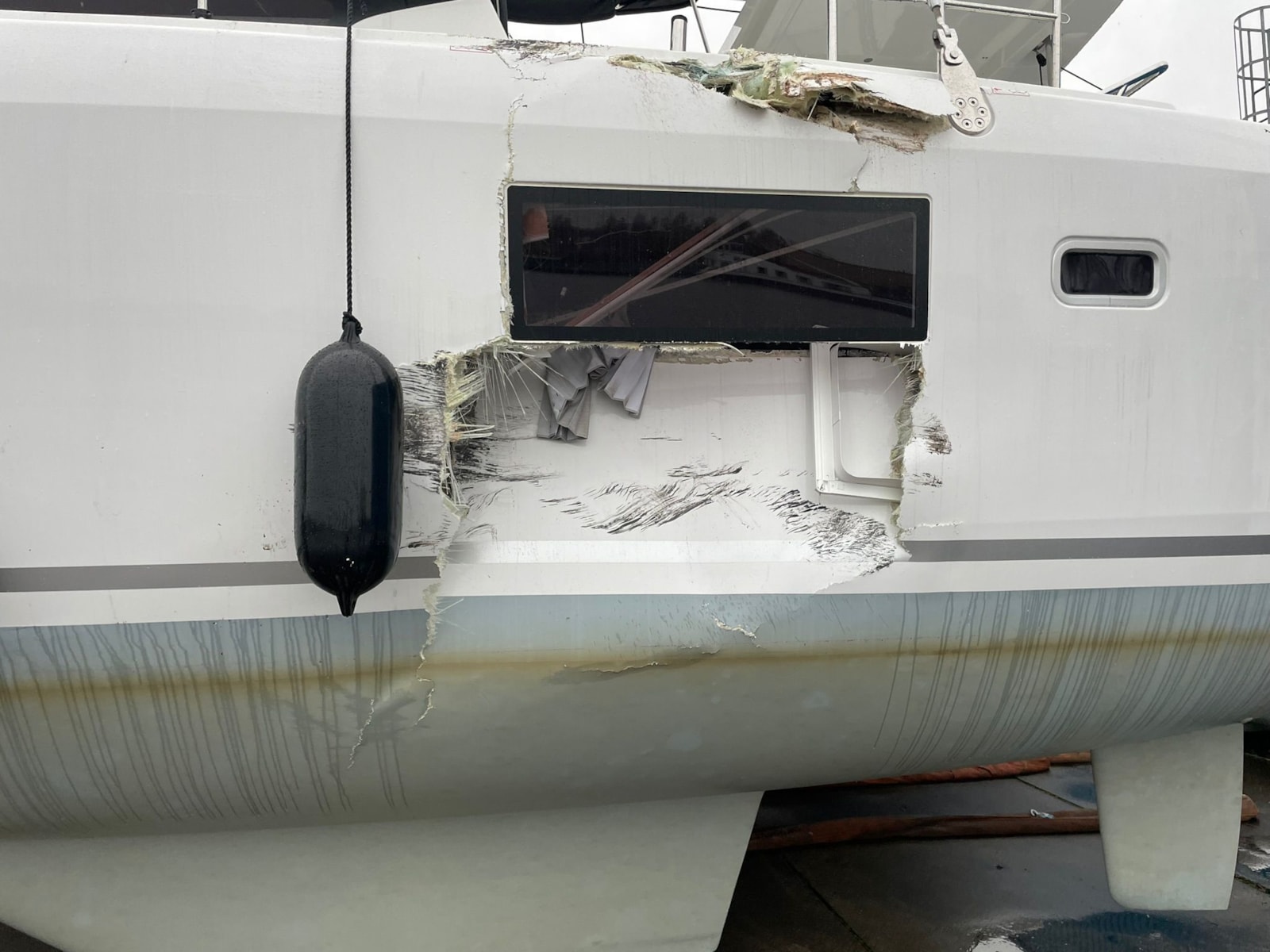’’We waren met de laatste voorbereidingen bezig, toen onze Lagoon 42 in een werkhaven in Heerenveen werd aangevaren. Op aanwijzing van een matroos dacht de kapitein van het vrachtschip genoeg ruimte te hebben om te kunnen draaien, maar ramde daarbij frontaal onze catamaran,’’ vertelt Geert Bosman.