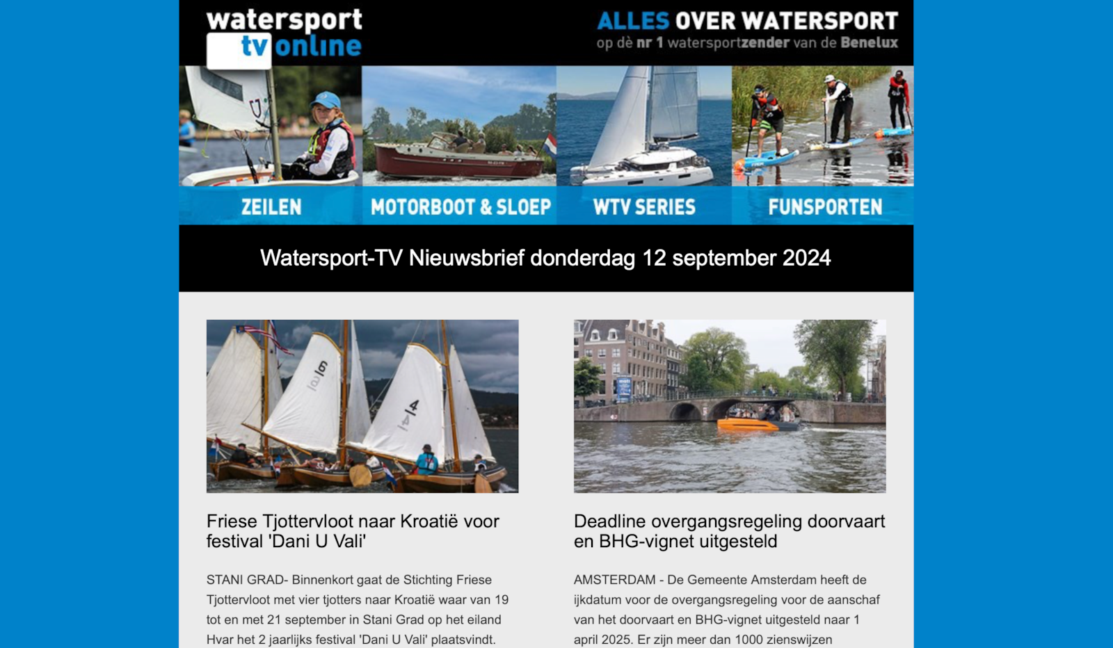 Duizenden watersportliefhebbers ontvangen wekelijks op donderdag onze nieuwsbrief met uiteraard veel nieuws, columns, vlogs, vaarimpressies, evenementen, primeurs, leuke acties en nog veel meer. Je kunt je gratis abonneren...Klik op Watersport-TV Nieuwsbrief