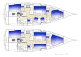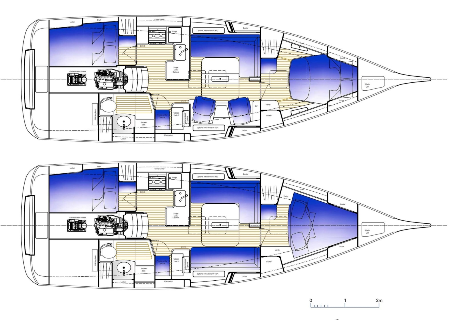 Aan stuurboordzijde is er de keuze tussen een traditionele rechte bank of de uitzonderlijk comfortabele Hallberg-Rassy fauteuils, een primeur voor deze klasse. Voor de fauteuils bevindt zich een extra bar met flessenhouder. In de voorkajuit heb je de keuze tussen een kooi van 2,04 m aan de rompzijde, met zitplaatsen, twee wastafelmeubels en een hangkastje, of, nog een primeur voor deze klasse, een kooi in het midden van de kajuit, met zitplaats, wastafelmeubel, hangkastje en veel bergruimte.