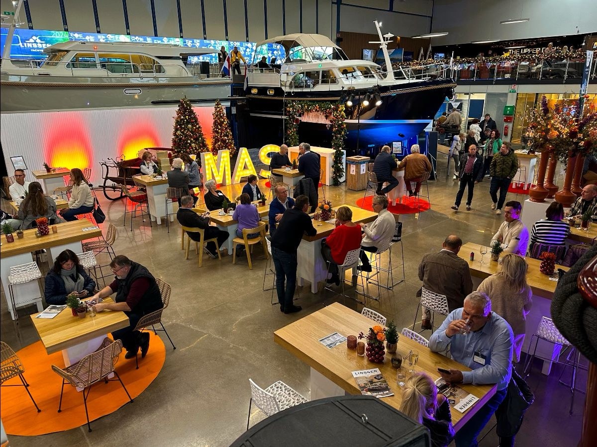 Op het ‘Upper Deck’ bij de bar heerste een levendige sfeer, waar de adviseurs en internationale dealers in gesprek gingen met (potentiële) klanten en bezoekers. Deze ontmoetingen, gecombineerd met de sfeervolle presentatie in kerstsfeer van onze jachten, zorgden voor waardevolle interactie en connecties.