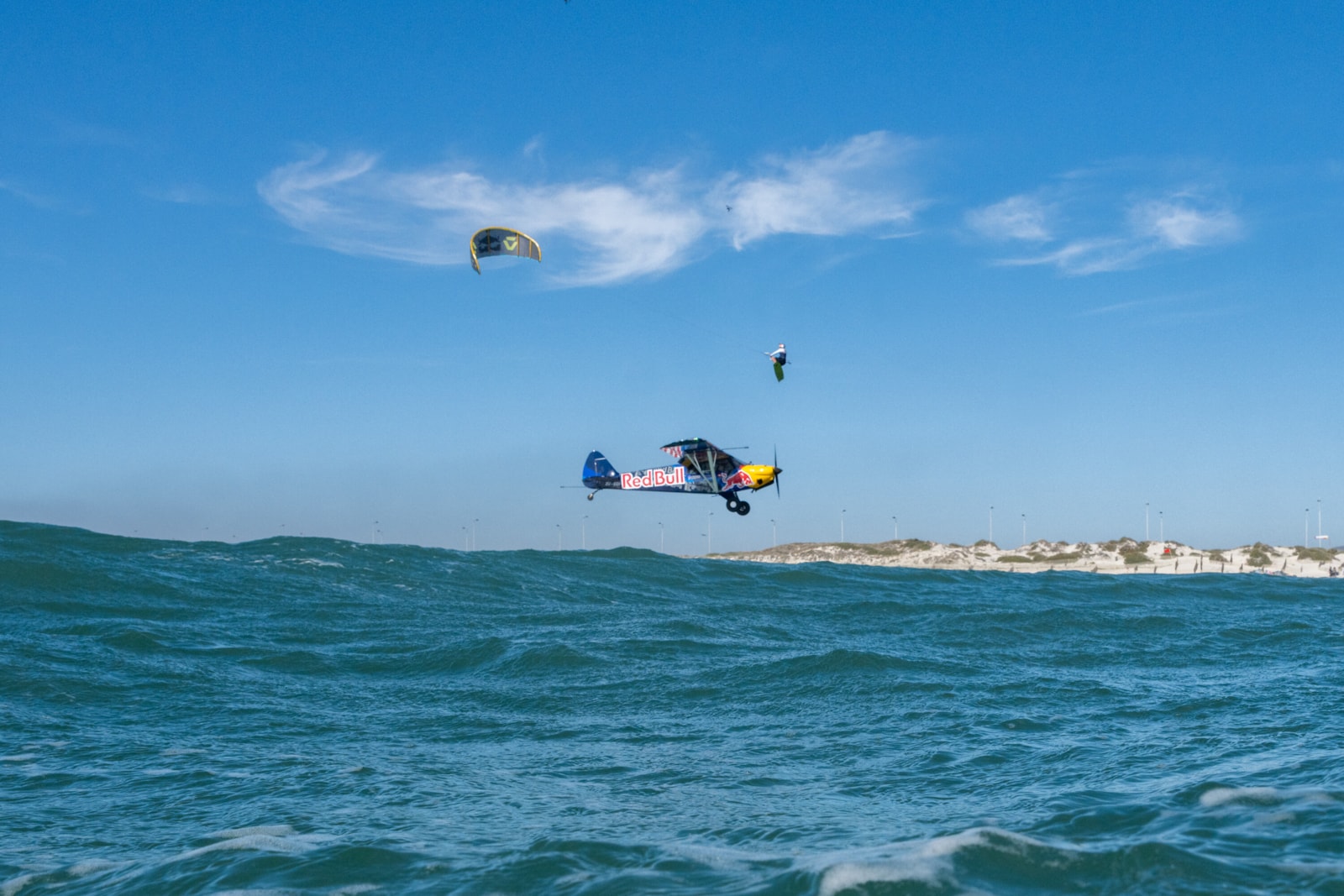 Lasse maakte met zijn kite een sprong van 15 meter hoog en vloog daarmee over het vliegtuig van Luke. De Poolse piloot wist het voertuig vakkundig stil te hangen boven het water met windstoten van meer dan 50 km/u.