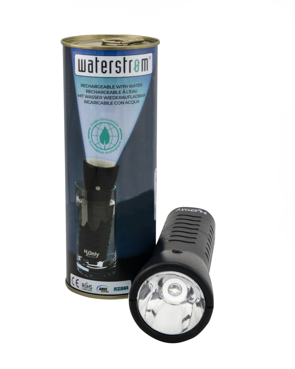 Een zaklantaarn die je kunt opladen door even kort, ongeveer 5 seconden, onder te dompelen in een glas water. Eenmaal ‘bevochtigd’ heb je een verlichtingscyclus van circa 12 uur.  De Waterstrøm oplaadbare waterlamp zit verpakt in een blik. Als je het blik ongeopend laat dan biedt de fabrikant 100 jaar garantie.