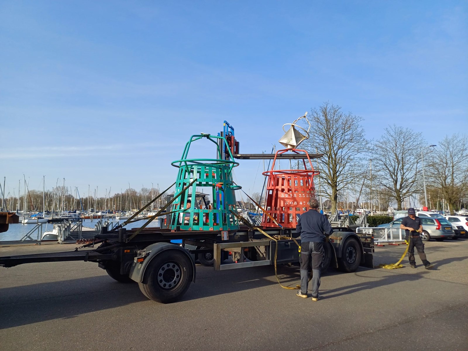 Misschien herinneren velen zich wel, dat er bij de ingang aan de Onderwal van de prachtige Jachthaven Naarden twee grote zee-boeien stonden. Enige tijd terug moesten die op last van de gemeente verwijderd worden, want de omwonenden klaagden er over. Voor een enthousiaste ligger in de haven een mooi handeltje, want hij heeft een bedrijf in metaal recycling en deze jongens wegen ruim 7 ton per stuk. Chang Wah is de eigenaar van Jakiro Metaal Recycling en hij kocht ze en transporteerde ze naar zijn bedrijf in Apeldoorn.