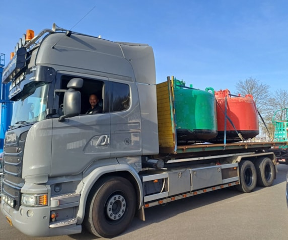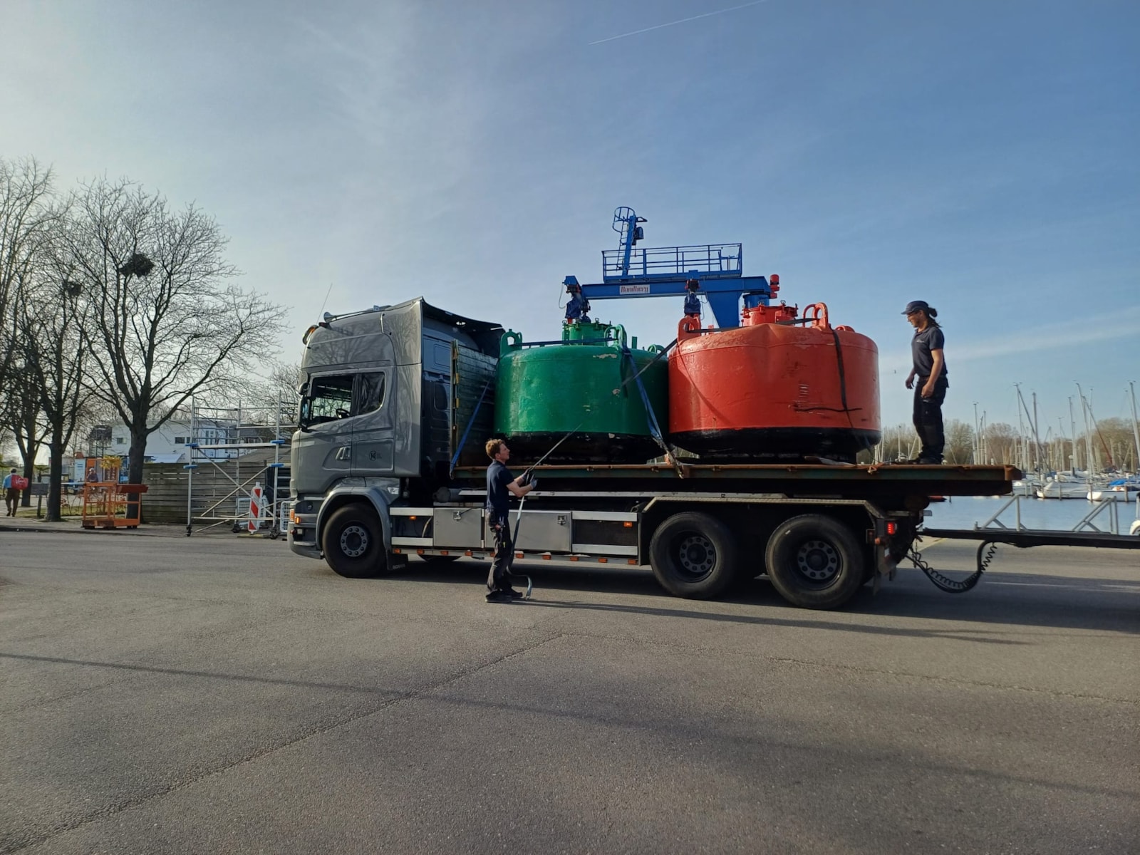 De haven gaat akkoord en ruim een week geleden kwam er een grote vrachtauto combinatie met de enorm zware boeien het jachthaventerrein oprijden. We waren erbij toen ze gelost werden en waren getuige van het spektakel, toen de zwaarste heftruck van de haven de kolossen met veel moeite loste. Eén ervan had een dikke deuk in de vorm van een scheepsboeg en lachend merk ik op; “Stel je voor als dit de boei zou zijn waar onze Meander V destijds als Loodsboot met 30 knopen overheen voer! Dan snap ik wel dat het schip lek voer, want deze jongens geven niets mee…
