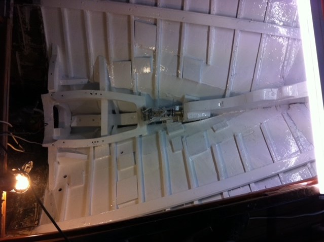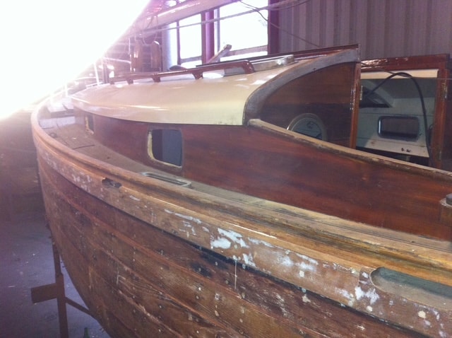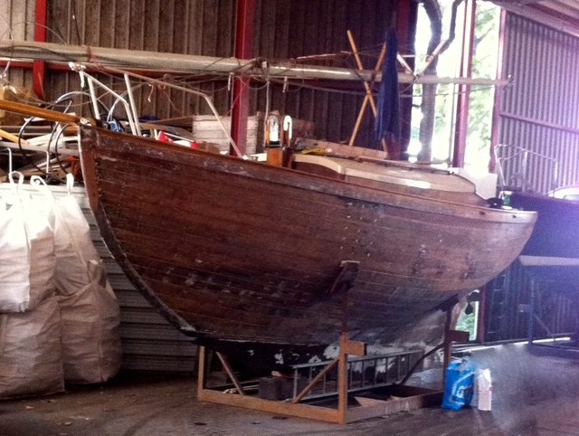 Er was een begin gemaakt met het ‘strippen’ van het jachtje, de huid was ontdaan. Op de romp was een polyester ‘doodskleed’ aangebracht om lekkage tegen te gaan. De binnenbetimmering was gedeeltelijk weggesloopt en de leidingen naar en van de ingebouwde dieselmotor waren verdwenen.