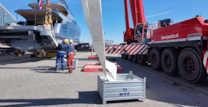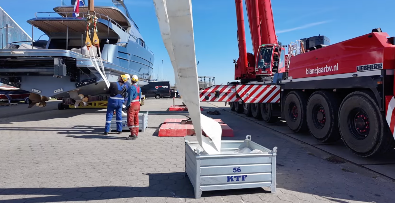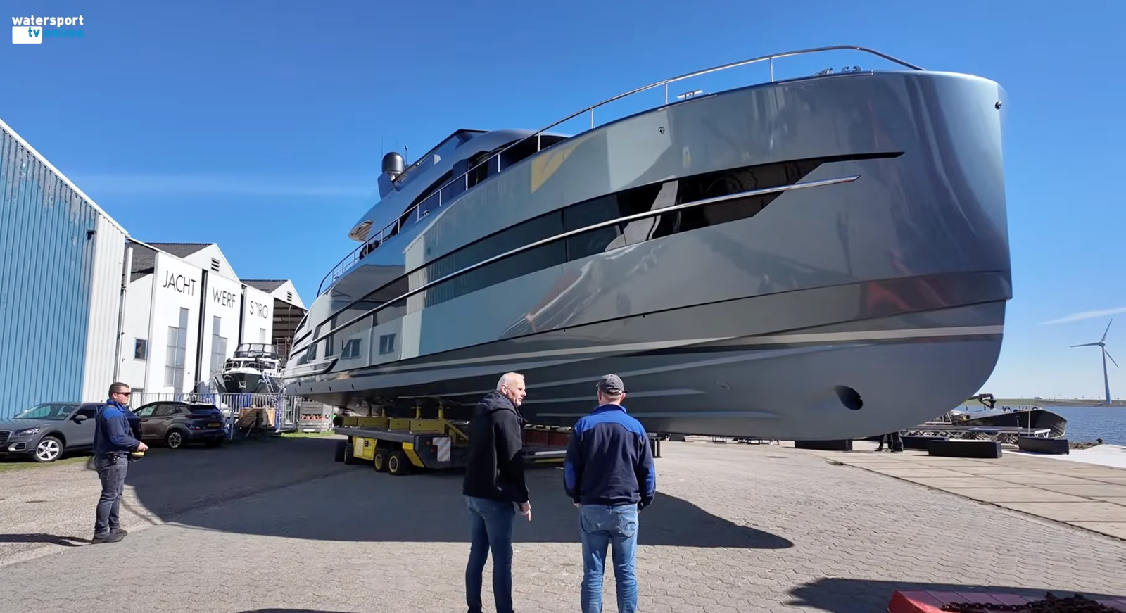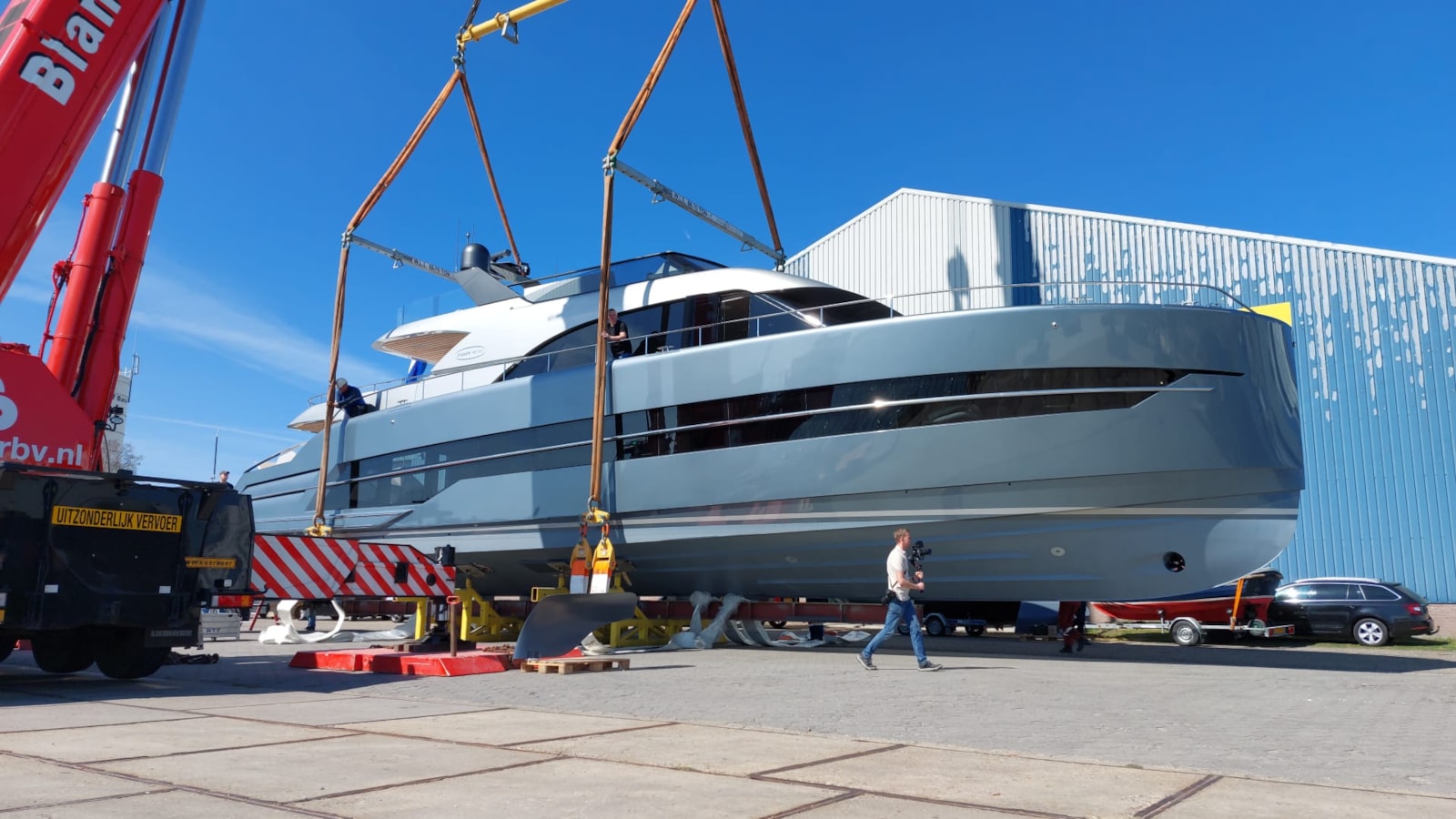 Met uiterste precisie moest het eerst uit de loods worden gereden waar het jacht is afgebouwd. Vervolgens stond er een megakraan klaar om het te water te tillen. Dit kan pas gebeuren nadat de vinnen van het stabilisatiesysteem waren gemonteerd. Onder toeziend oog van de eigenaren kon de 85-voeter daarna het water van het IJsselmeer proeven. Na de laatste proefvaarten vertrekt het op een transportschip binnenkort naar een zonnige bestemming.