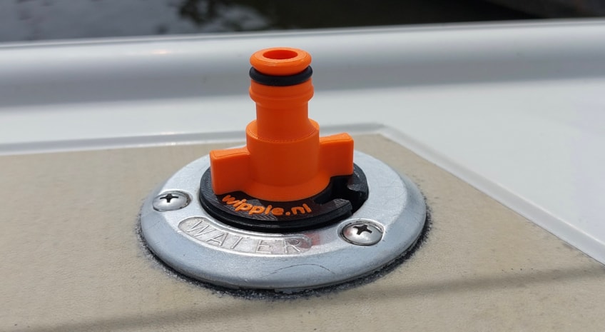 De Wipple schroef je in de vuldop van de watertank van je boot. Vervolgens klik je je waterslang vast op de Wipple met een koppelstuk zoals dat van bijvoorbeeld Gardena. De click-aansluiting is getest op hoge druk en blijft stevig zitten. De aansluiting is gemaakt van slagvast kunststof en belangrijk drijft op het water. Soms heb je een lierhandel nodig om de vuldop te openen. Dat kan met de Wipple ook.