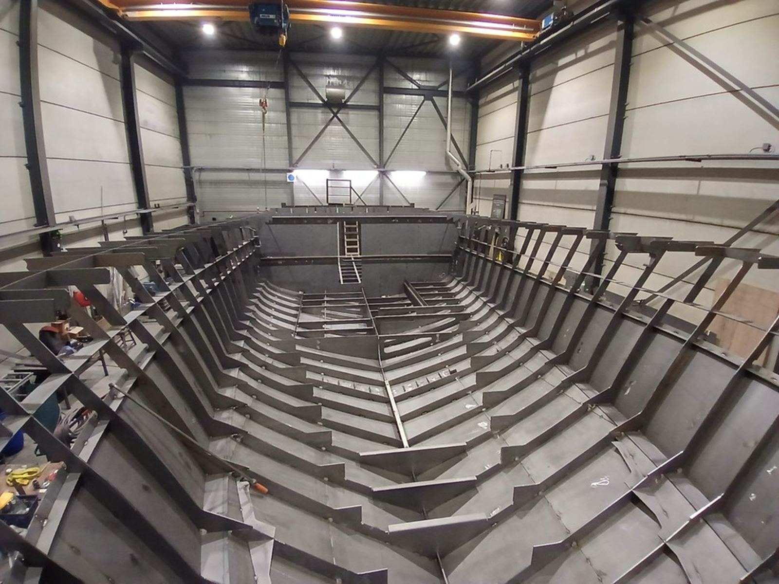 Uiteraard ligt de Meander V altijd vaarklaar in Monnickendam om uit te varen in dit soort situaties, maar na 20 jaar willen we ook wel eens weer gaan trekken met ons schip en dan is er geen reserveschip meer. Na jarenlang hard sparen konden we vorig najaar aan de fa. Altena Yachting opdracht geven voor de bouw van de Vaarwens II. In januari kwam er een vrachtwagen met een gigantische staalpuzzel van meer dan 900 stukjes en de constructeurs begonnen direct met het samenstellen van het schip.