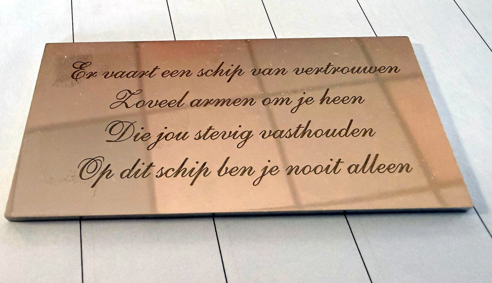 Deze keer hebben we onze ambassadeur Maarten Peters (echtgenoot van de overleden zangeres Margriet Eshuijs) een plaatje in de kiel laten lassen met daarop enkele woorden uit de tekst van het speciaal voor onze stichting geschreven vaarwenslied staan.