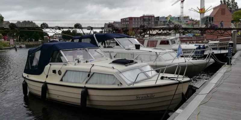 De eigenaren van de Straycat hebben hun motorboot aan de watersportsteiger afgemeerd. De boot is te koop.