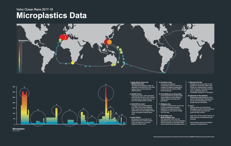 Nieuwe data onthullen microplastics in ‘s werelds meest afgelegen oceaan. De monsters zijn dichtbij Point Nemo genomen door de teams van AkzoNobel en Turn the Tide Plastic die deelnemen aan de Volvo Ocean Race, het punt op aarde dat het verste punt van land vandaan ligt.
